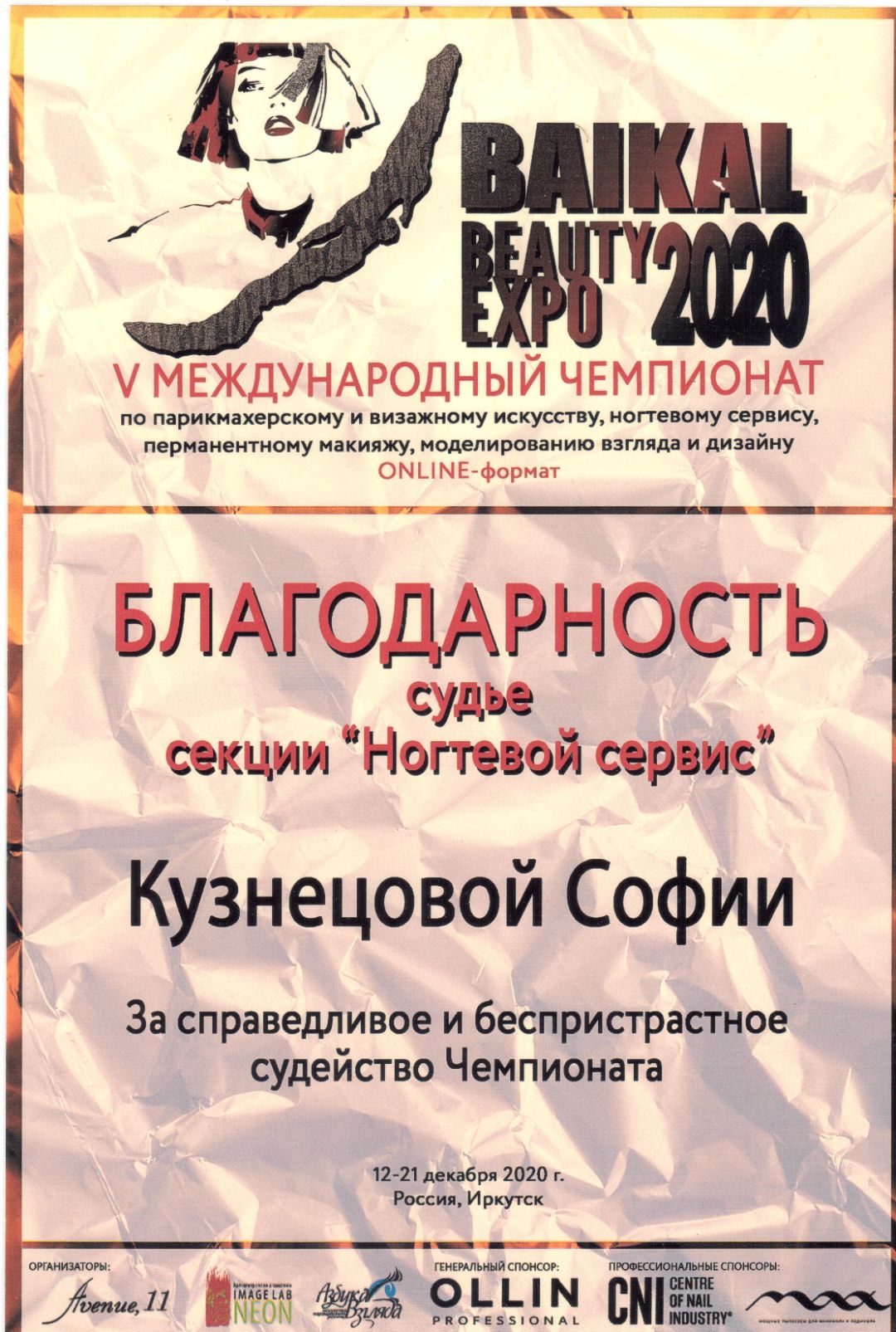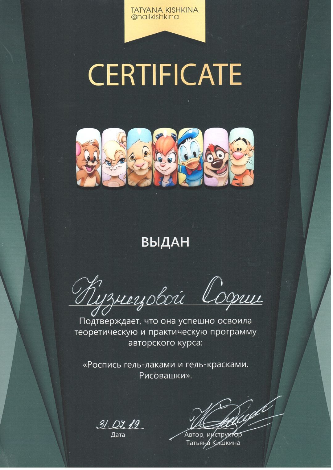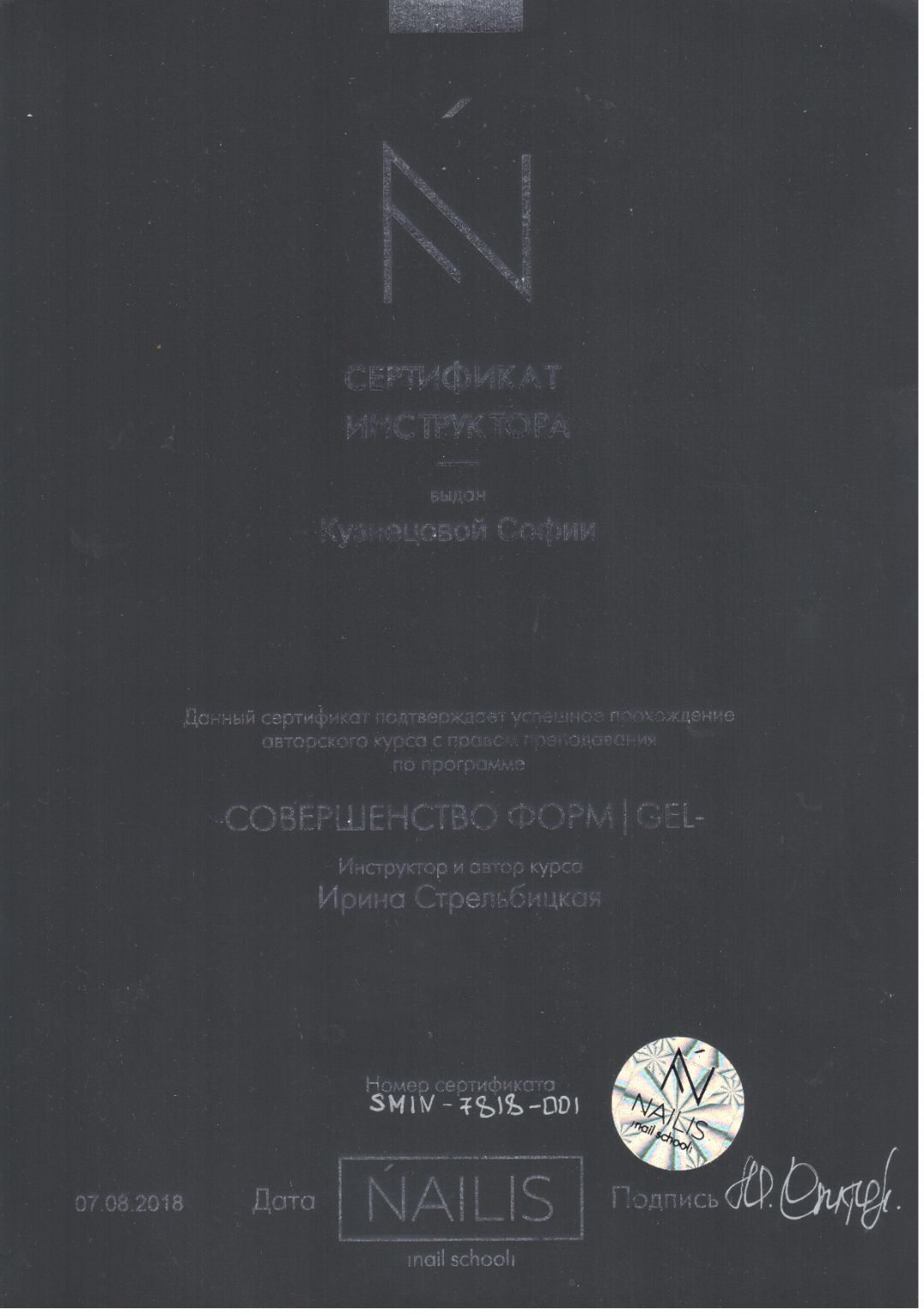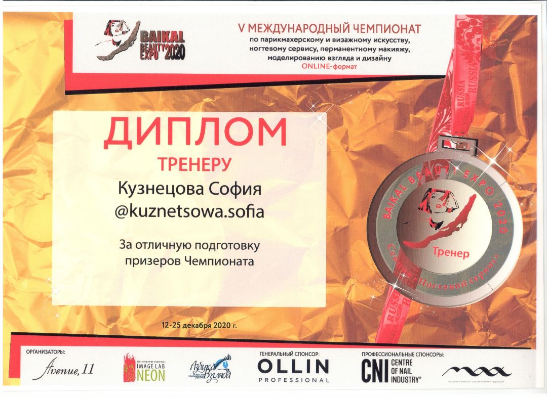 Чемпион Европы по моделированию и дизайну ногтей. Сертифицированный мастер международного уровня. Судья конкурсов и чемпионатов в ногтевой секции. Огромное достижение Софии - это её ученики, которые в настоящее время являются достойными мастерами, высочайшего уровня и завоевывают призовые места на конкурсах и чемпионатах всего мира.